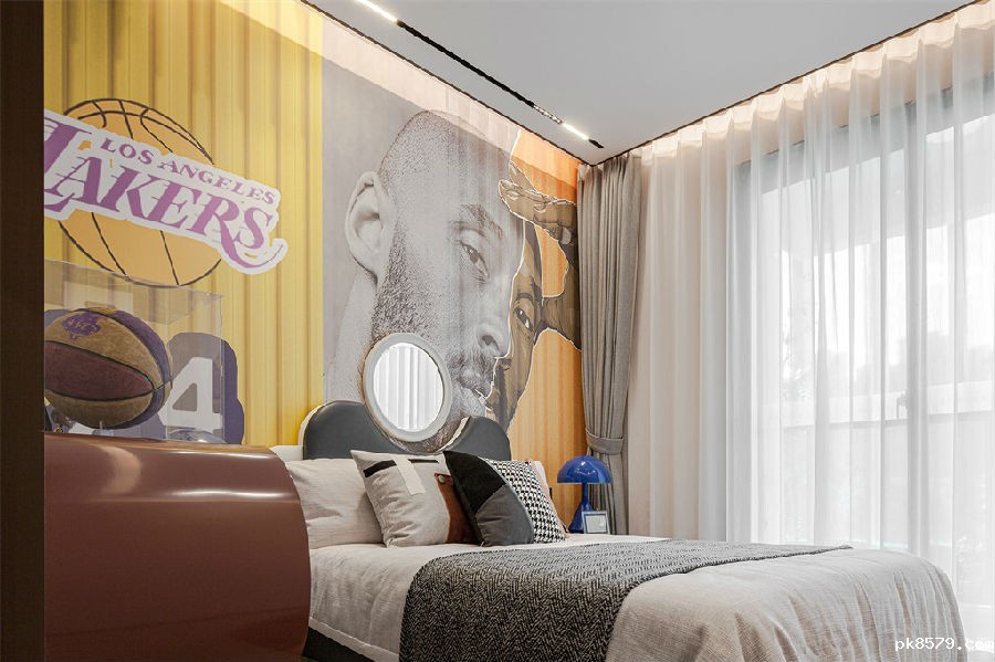 次卧则是儿子的天地,设计师以球类运动为主题,巧妙地在床头设计了科比的形象墙和专属序号。这不仅体现了男孩的个性与热爱,更为这个空间增添了一份独特的纪念意义。