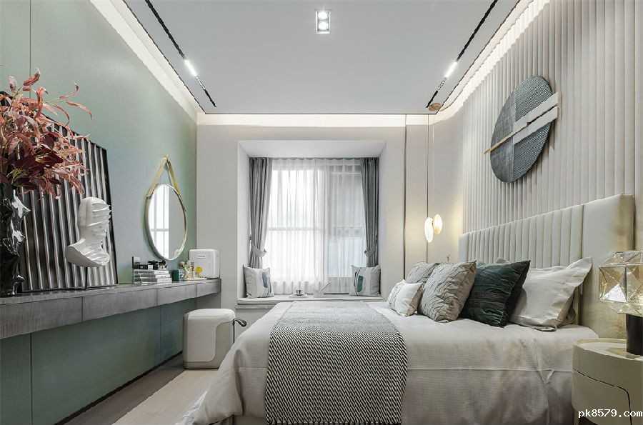 主卧室延续了客厅的整体色调,奶绿色与灰色的交融,如同清晨的薄雾,清新而舒缓。一面墙的涂刷与其他白色区域形成鲜明对比,宛如一幅水墨画,勾勒出居室的宁静与雅致。