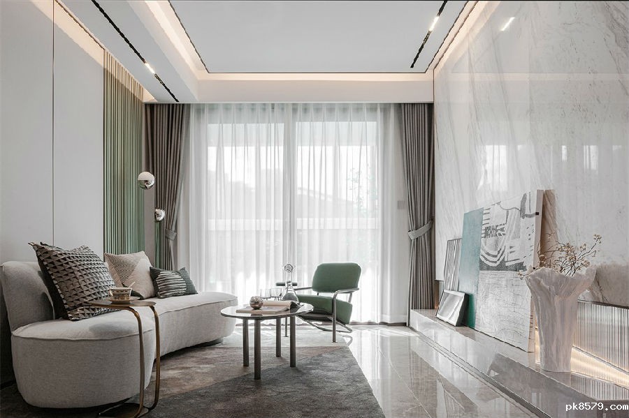 整体色调淡雅清新,如同初春的晨露,给人带来宁静与舒适。石材打造的电视墙,简约而不失现代感,宛如一幅未经雕琢的画卷,自然流露出整洁与光泽。
