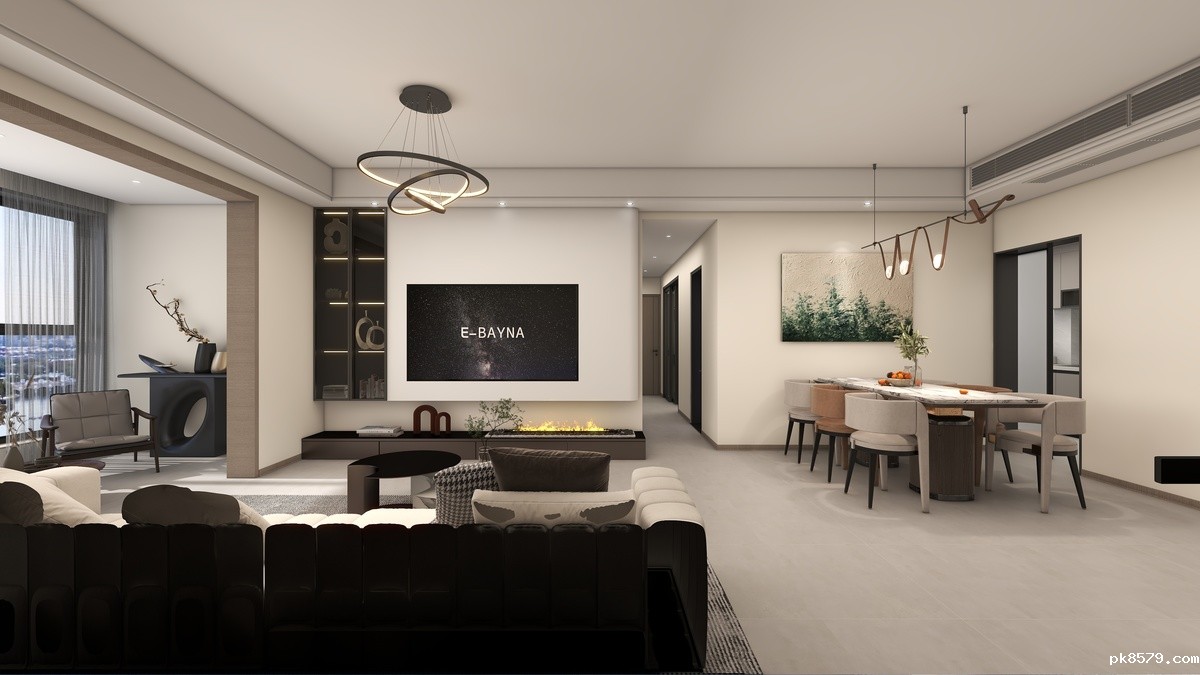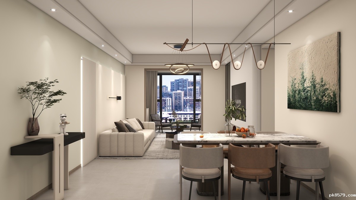 客餐厨的家具风格和谐统一,美观的餐桌与实用的厨房紧密相连,营造出摩登时尚、即时互动的就餐氛围。